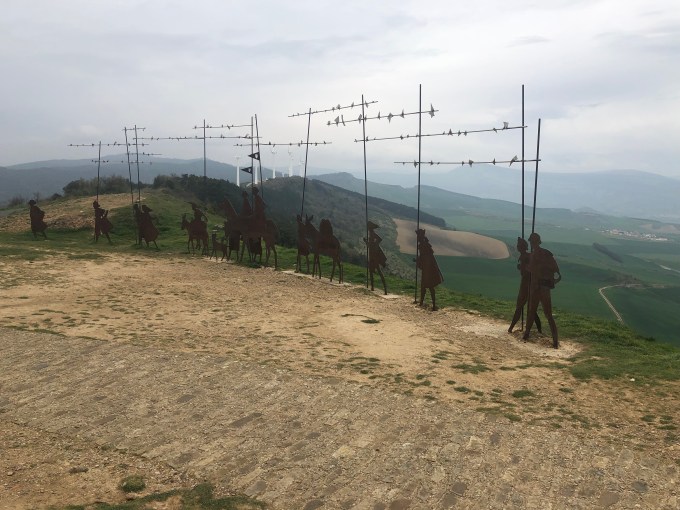 Just outside Pamplona is the Alto del Perdon (Hill of Forgiveness) which is a highlight of the Camino. At the top of the hill is a series of sculptures representing pilgrims over the centuries. The sculptures share the hill with a number of wind turbines which stand guard over Pamplona and Puente la Reina, my destination for the day. The above words are inscribed on the statues and translated mean ” where the path of the wind crosses that of the stars”.