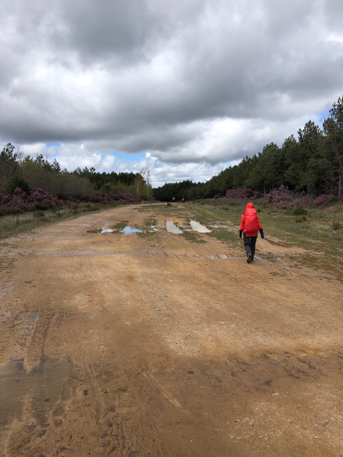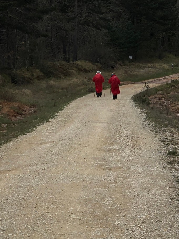I experienced four seasons in one day on my journey today. The leg from Belorado to San Juan de Ortega “enjoyed” sleet, rain, sun and a lot of wind. It was very changeable and so people made the decision to wear a rain poncho or backpack cover throughout the day. The effect was to have what looked like a procession of turtles going down the trail throughout the day. A few of the images give some idea of what I experienced