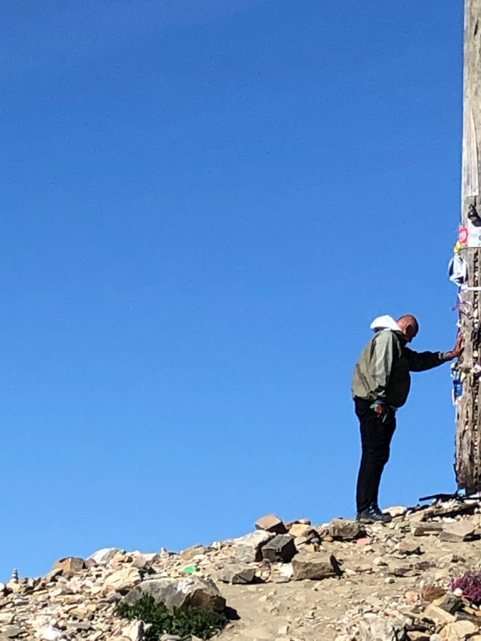 (On a lighter note, just before I arrived at the cross, a pilgrim stripped off completely and then climbed to the top of the cairn where he proceeded to “hug” the base of the cross). It wasn’t that warm at 1500m so he was pretty brave!
